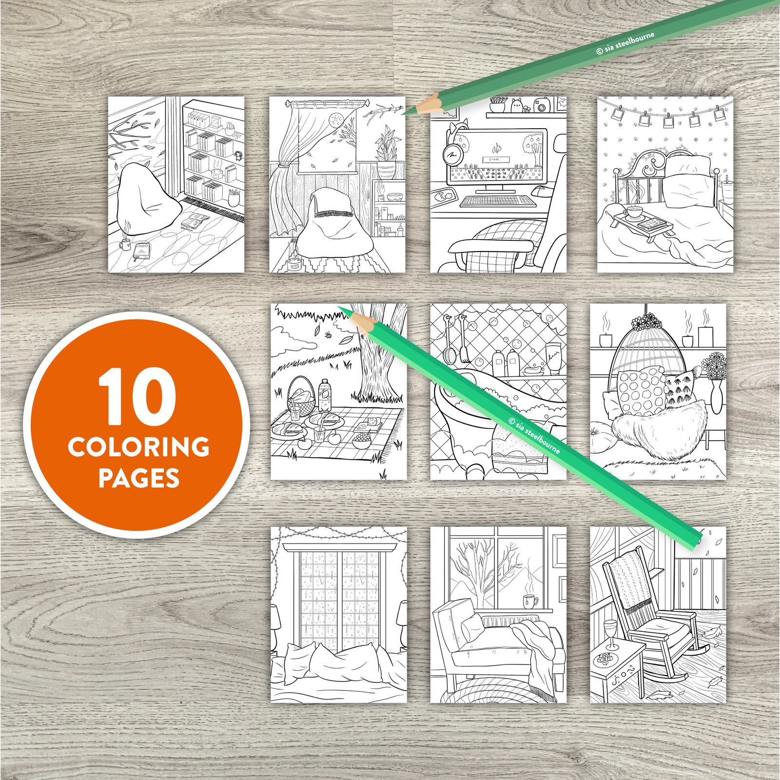 10 cozy rooms and spaces to color! Something for every mood. Relax and color cute comfy cozy place designs. Hours of fun to color. Color couches, beds, baths and more. Relaxing coloring pages for you to enjoy. Easy and fun activity for adults and kids.