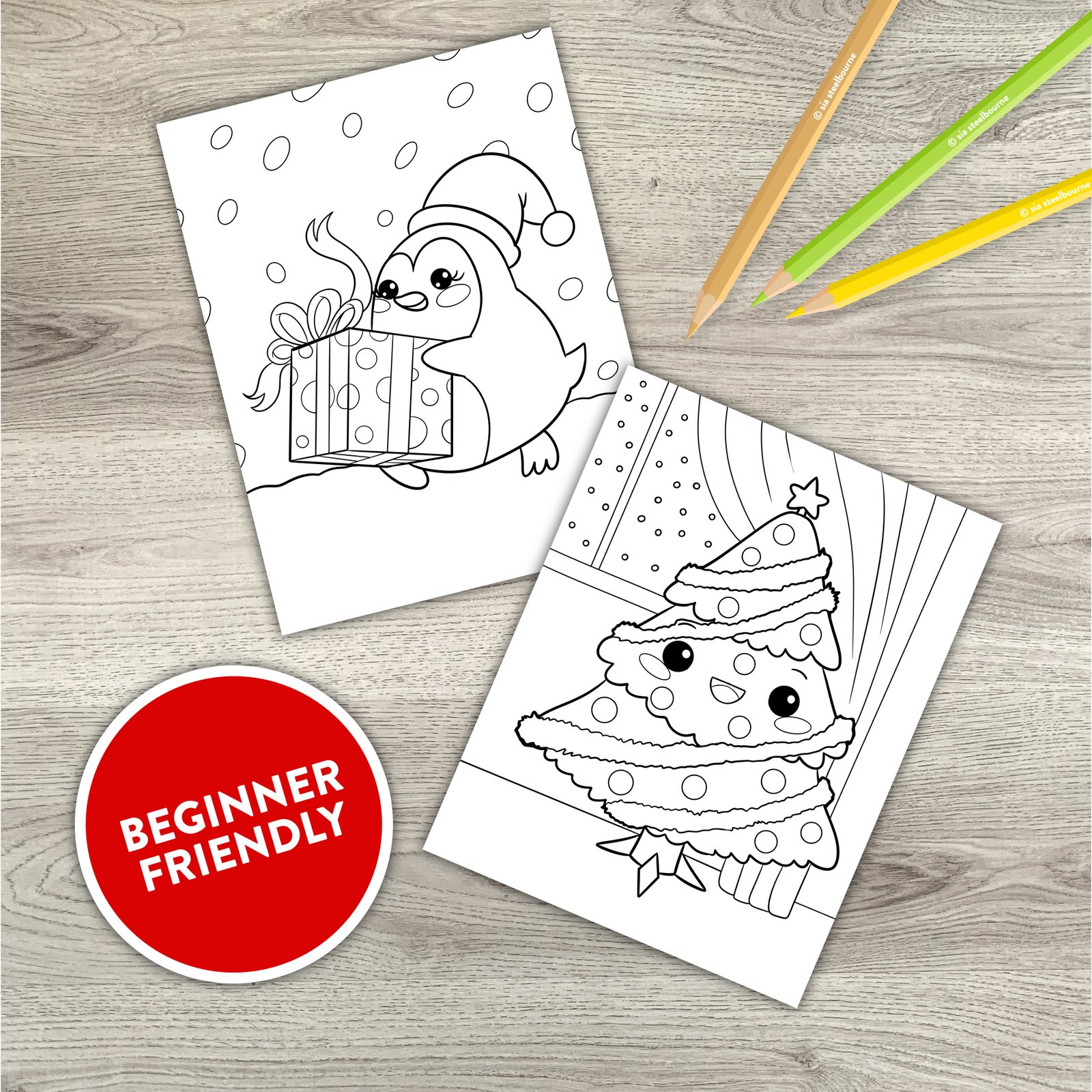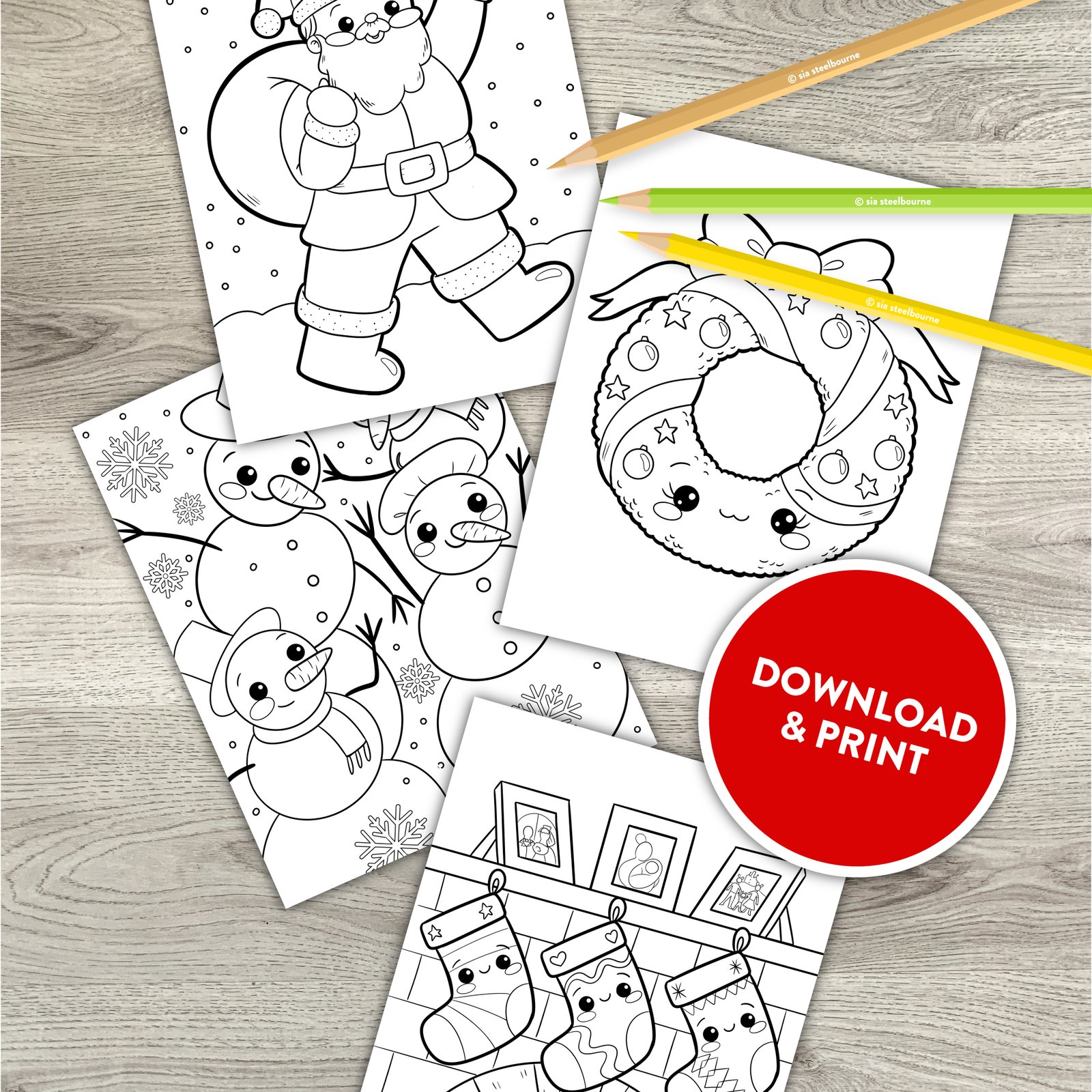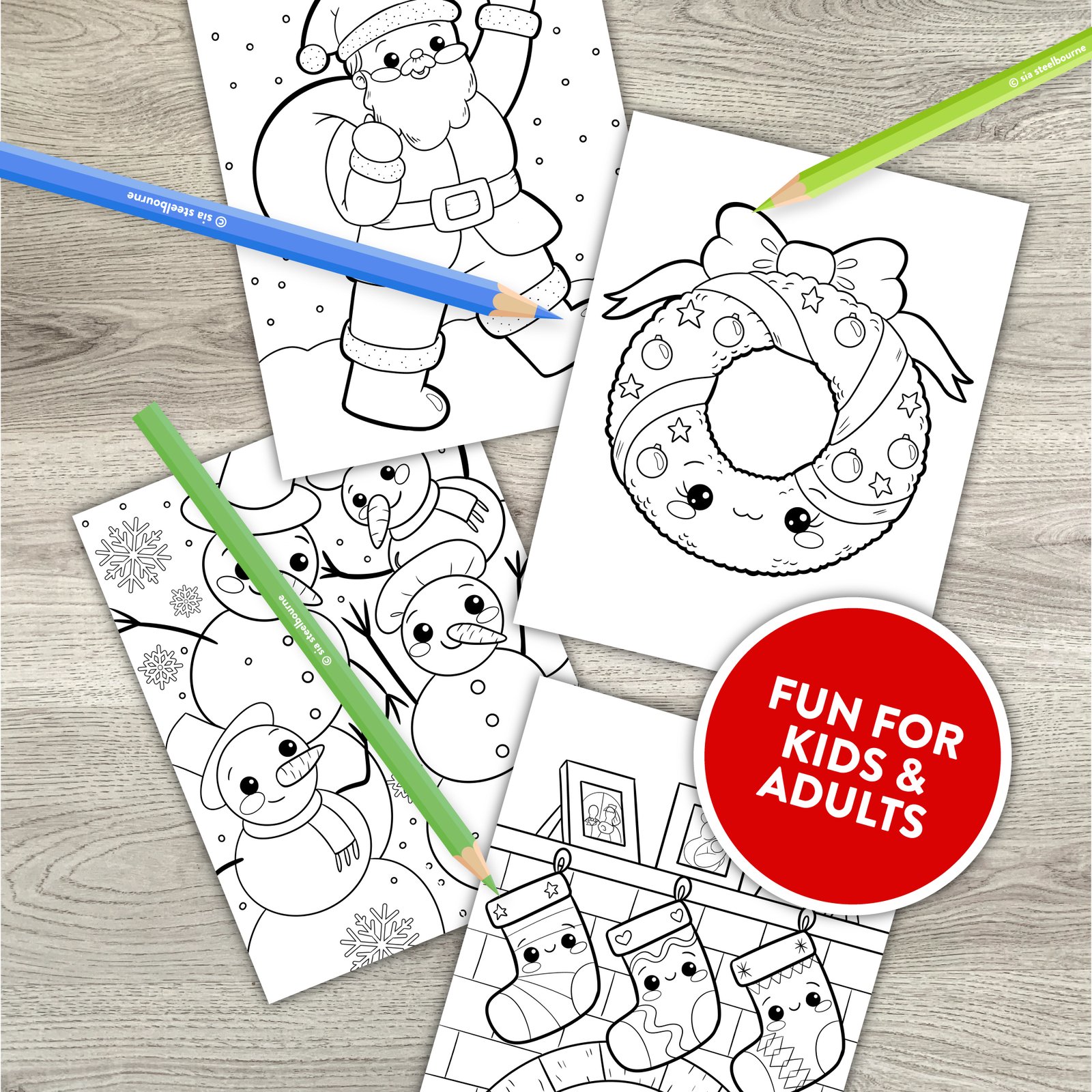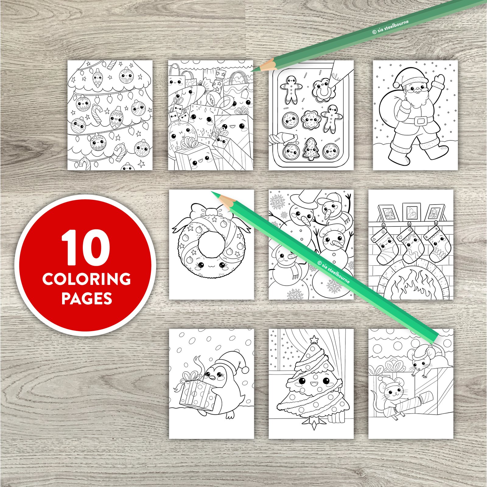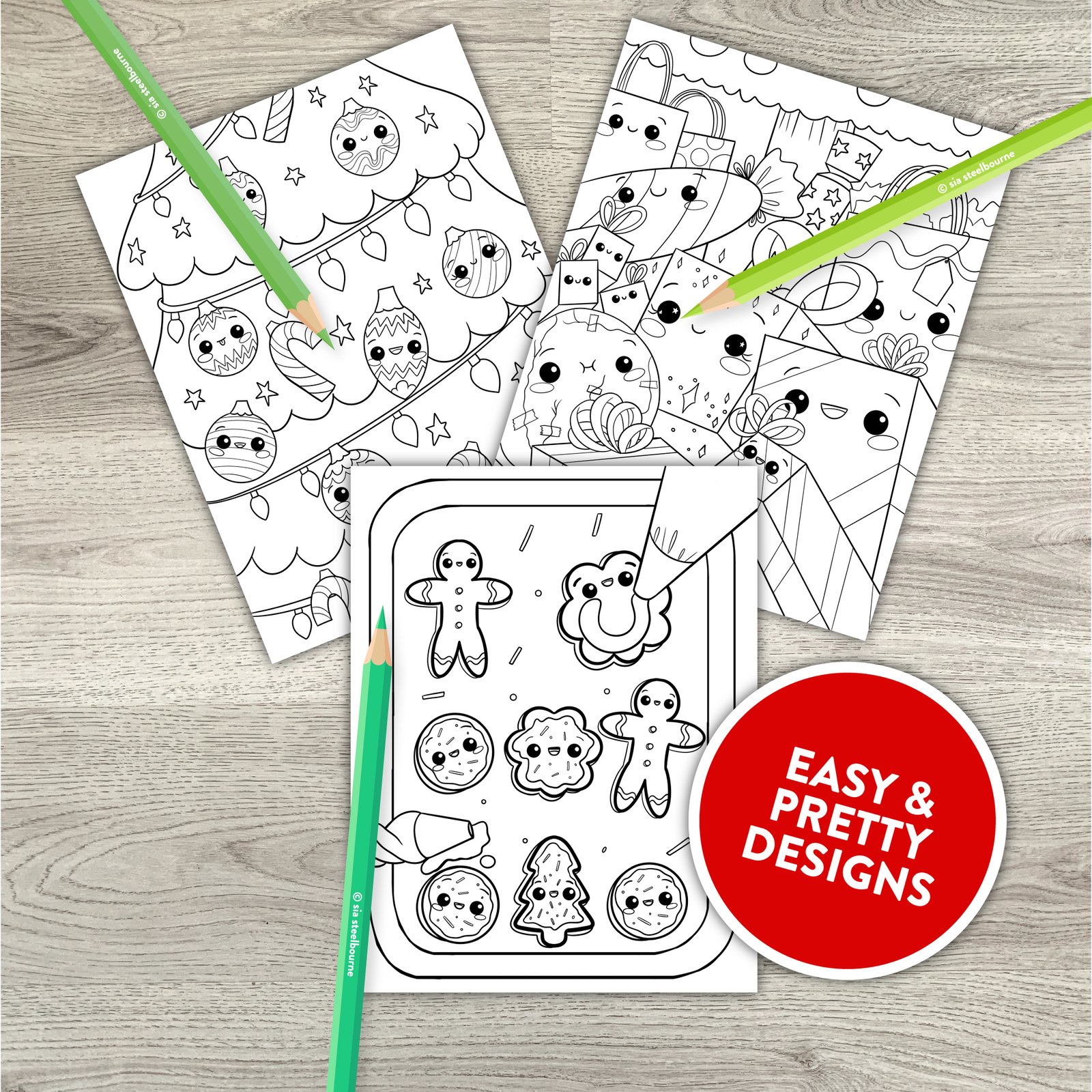 10 adorable kawaii Christmas doodles to color! Something for every mood. Relax and color cute food and animals designs. Hours of fun to color. Color wreaths, stockings, cookies, cozy animals and more. Relaxing coloring pages for you to enjoy. Easy and fun activity for adults and kids.